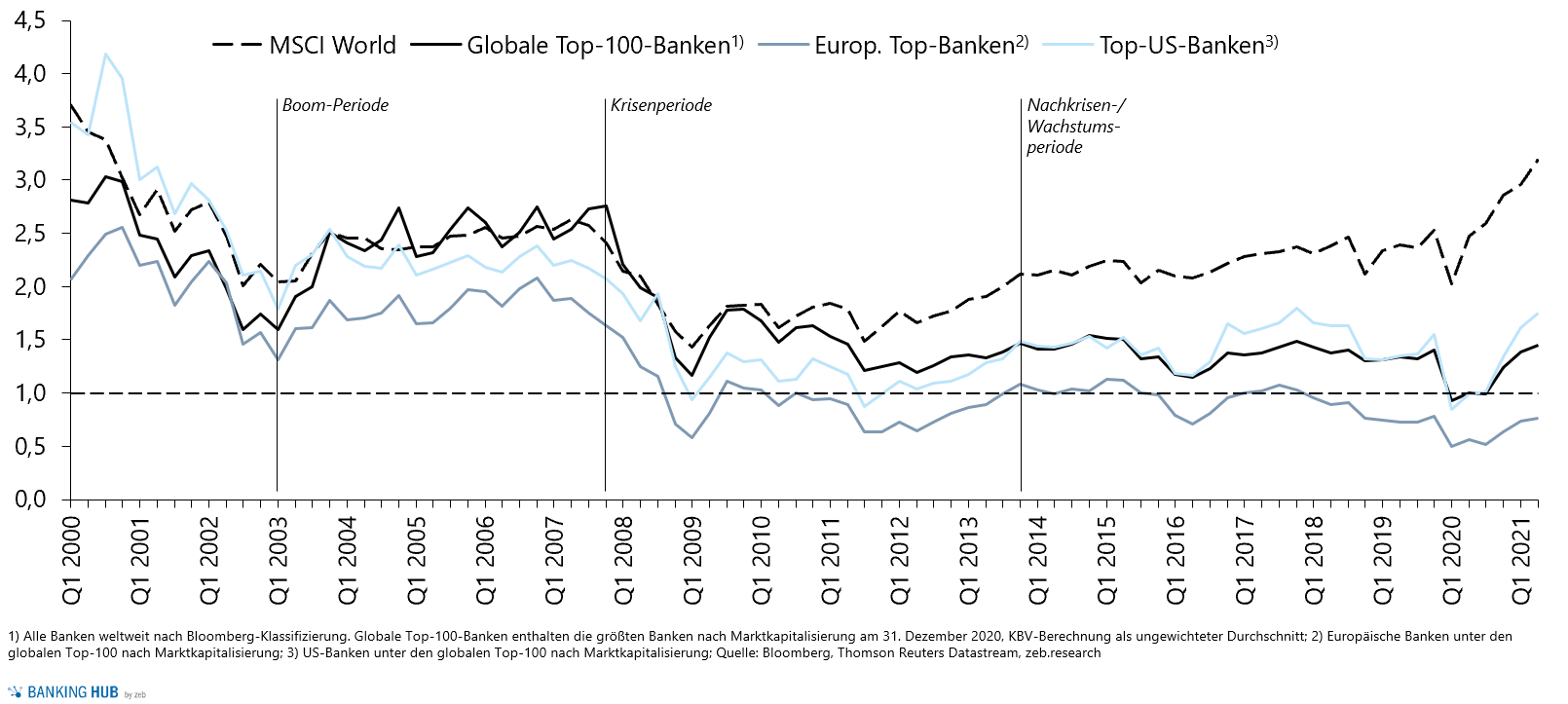 Ein KBV bei Banken unter 1 wird als eher günstig angesehen.